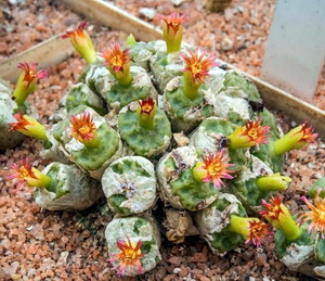 Popis: Drobná, trsovitá rastlina, vytvárajúca v prírode skupinky o priemere až 80 mm (v kultúre až 120 mm). Obal je belavý, vytrvávajúci, stonky 8-18 x 4-10 x 3-7 mm veľké, obklonické až uťaté na vrcholu, svrchu štvorhranné, často s dvoma krížovitými hrbmi a množstvom menších hrbolov, epidermis holé, trochu priesvitné, sivozelené alebo žltohnedé až červenozelené, svetlejšie na hrboloch, po stranách často tmavočervene sfarbené, prehĺbenina je krátka, lemovaná priesvitnou zónou, skoro holá. Kvety sú nočné, silne voňavé, červenopurpurové. Tobolka 5-7 chlopňová, mnohosemenná, asi 2 x 3 mm veľká, biela. Semená drobnúčke, bradavičnaté, o veľkosti 0,55 x 0,40 x 0,30 mm.