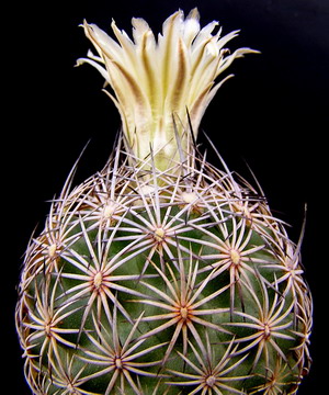 Popis: Stonka jednotlivá, modrozelená, vajčitá až pretiahnuto vajčitá, 70-110 mm vysoká, 50-75 mm silná, s 13-21 rebrami. Bradavky asi 10 mm dlhé, 6 mm široké, areoly eliptické, 3 mm široké a asi 10 mm od seba vzdialené. Tŕne husté, takmer zakrývajúce stonku, stredové tŕne svetlo žltohnedé, k vrcholu sivé alebo hnedé, najčastnejšie po 4, 20-25 mm dlhé. Počet okrajových tŕní 12-14, trošku menšie ako stredové, lúčovito rozložené okolo areoly. Kvety asi 25 mm dlhé a rovnako široké, ružové až biele. Plod zelený, v plnom zralosti hnedý, s málo bielymi, blanitými, veľmi širokými šupinami. Zaschnuté okvetie vytrváva na plodu až do úplnej zralosti. Semená čierne, drobno sieťovito bradavčité, sploštene obvajčité, 1,5 mm dlhé, 2 mm široké a 1 mm silné.