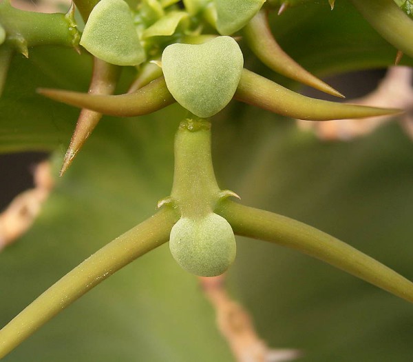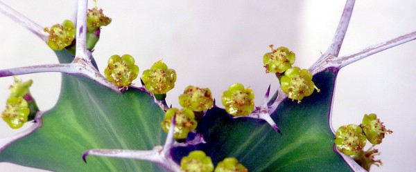 Lesklé, žltozelené cyanthiá sa objavia v najmladších partiach Euphorbia grandicornis