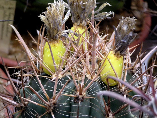 Popis: Rastlina je jednoduchá, v počiatku pravidelne guľovitá, neskôr krátko stĺpovitá, obvikle 70 cm vysoká a 25 cm široká, matne olejovo- alebo sivozelená. Počet rebier je najviac 13, sú rozdelené na mierne hrboly, priame. Areoly sú predĺženo-ovalné, svetlohnedou alebo snehobielou vlnou, asi 1,2 cm široké. Otŕnenie je typické, počet stredových tŕňov 4 kusy, rovné, sivej farby, povrch je s kruhovanými brazdami, 4,5 cm dlhé, smerujú nahor, spodné sú dlhšie (niekedy omnoho), ploché, špica je zohnutá, niekedy až háčkovitá, dlžka môže byť až 10 cm. Počet okrajových tŕňov je 15, z toho horných 12 kusov sú štetinovité, svetlejšie, lúčovito rozložené, 3 spodné viac pripomínajú vlastnosti stredových tŕňov, neraz sú rovnocennými s nimi. Na kvetuschopných areolách za stredovými tŕňmi sa objavia tkz. extraflorálne nektárialne tŕne, ich počet môže byť až 12 kusov. Kvety sú žlté, lievíkovitého tvaru, 6 cm dlhé, 7 cm široké. Prachové tyčinky sú 10-20 mm dlhé, žlté alebo ružové, tyčinka je žltá, 35 mm dlhá, blizna je rozdelená na 16 lalokov. Plod je žltý, plný, 5 cm dlhý a 3,5 cm široký, zo zbytkom okvetia má dlžku až 7-7,5 cm. Semená sú tmavo hnedé alebo čierne, 1.5 mm široké, povrch semeníka je zdobený plytkými jamkami. Hilum je malé, okruhlé, asi 0,5 mm v priemere.