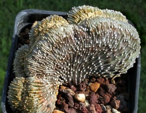 Popis: Stonka jednotlivá, guľovitá až plosko guľovitá, okolo 200 mm vysoká aj široká, sivozelenej až sivomodrej farby. Rebrá hladké, asi 20 mm vysoké, tenké, v počtu 15-20, v najužšom mieste zakončené korkovitou hranou, ľahko sa od rebier pri základe oddelujúce, na okrúhlych areolách niekoľko 2-15 mm dlhých korkovitých, sprvu krémovo žltých, neskôr tmavnúcich tŕní, narástajú na najmladších areolách spolu s hustou vatou, skoro odpadávajúce, areoly neskôr holé. Kvety vyrastajú z najmladších areol, šírka kvetu 40-50 mm, tmavoružové až červenofialové. Plod dužnatý, asi 9x5 mm veľký, so zbytkami zaschnutého okvetia. Semená lesklo čierne, s drobnými nízkymi bradavkami pokryté, asi 1 mm dlhé a 0,7 mm široké, s výrazným mäsitým hilom.