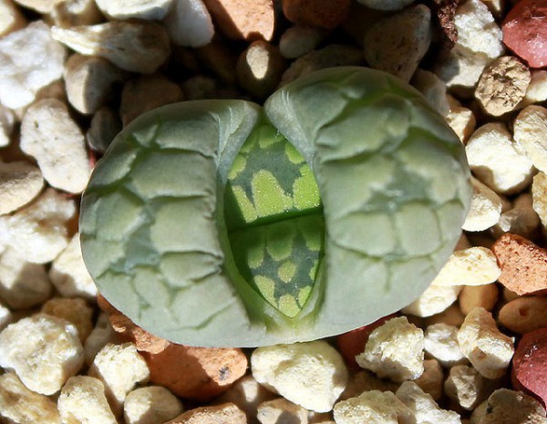 Popis: Veľmi nápadná vďaka svojím musľovitým okrajom a kruhovitým ostrovkom. Jej profil je kordátno-trunkátny, horný povrch konvexný (vypuklý), šterbina dosť hlboká, 8-13 mm, jednotlivé listy väčšinou troška divergentné. Povrch je na zároveň s terénom až trošku vyvýšený, väčšinou eliptycký, nejasne priehladný. Listové laloky nemusia byť rovnaké, na porchu hľadké alebo jemne rugózne. Svetle sivé alebo zelené okraje, často s nádychom do ružova, väčšinou veľmi zretelné, vykrajované okruhlými poloostrovkami. Okienka sú zbarvené v odtienoch modrozelenej alebo sivozelenej, uzatvorené okruhlé ostrovčeky majú farbu okrajov, výnimočne otvorené, ale s vykrajovanými okrajmi. Kanálky medzi ostrovkami sú väčšinou široké. U rastlín s početnými ostrovkami redukované a zúžené. Rubrofikácia chýba, tmavé bodky sú neviditeľné. Dorastá do malých rozmerov maximálne 30-20 mm a tvoria mnohohlavé trsy. Žlté kvety s bielym stredom o veľkosti až 35 mm sa objavujú koncom leta alebo začiatkom jeseňa. Člnkovité tobolky s rovným vrcholom obsahujú 5 púzdier. Semená sú žltohnedé, jemne bradavičnaté.
