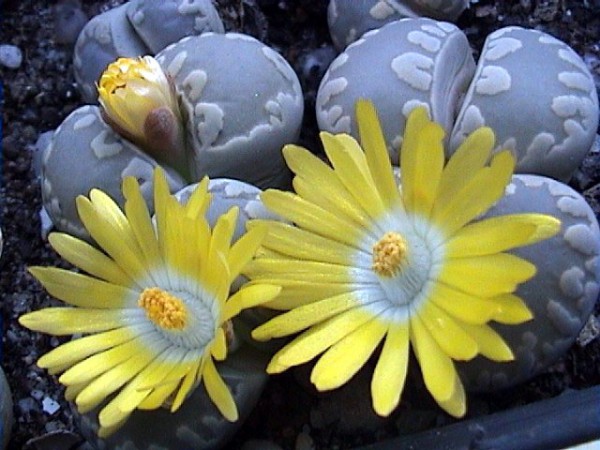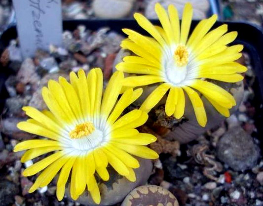 Dvojfarebné kvety Lithops otzeniana, na ľavo je C129, na pravo C350