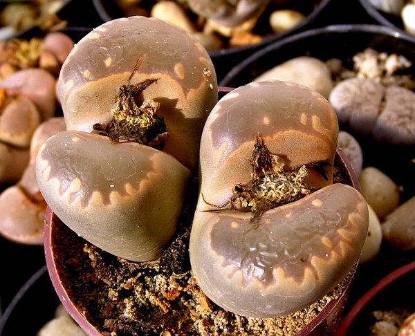 Lithops otzeniana, vľavo C128, vpravo C280, pestované vo voľnej kultúre,